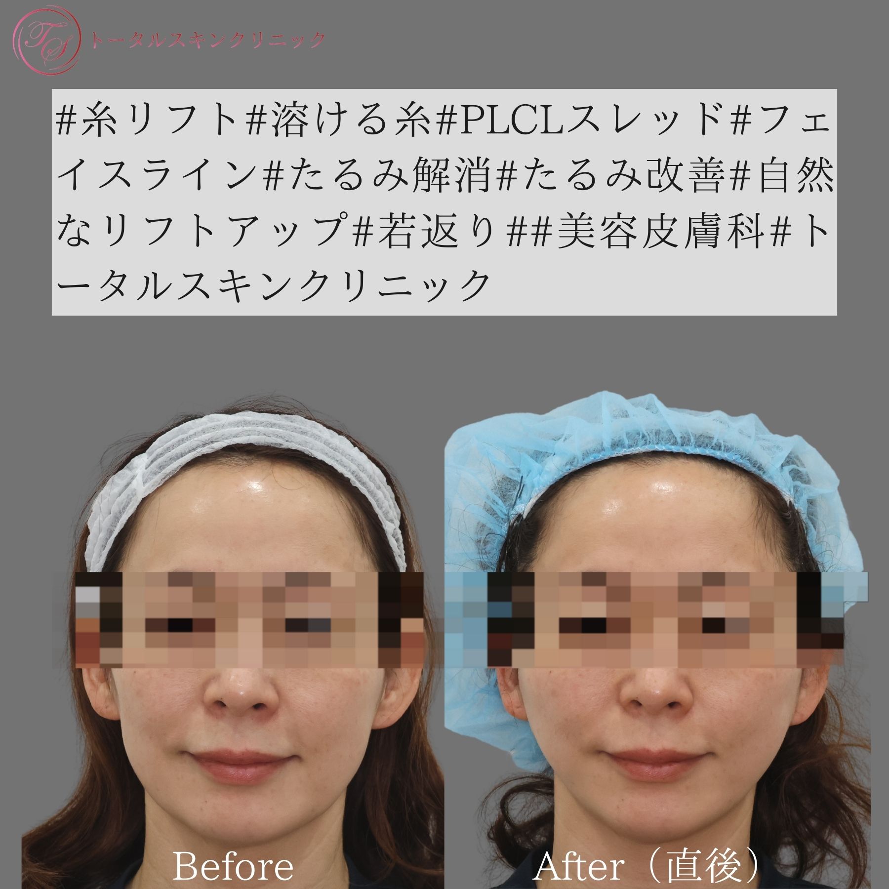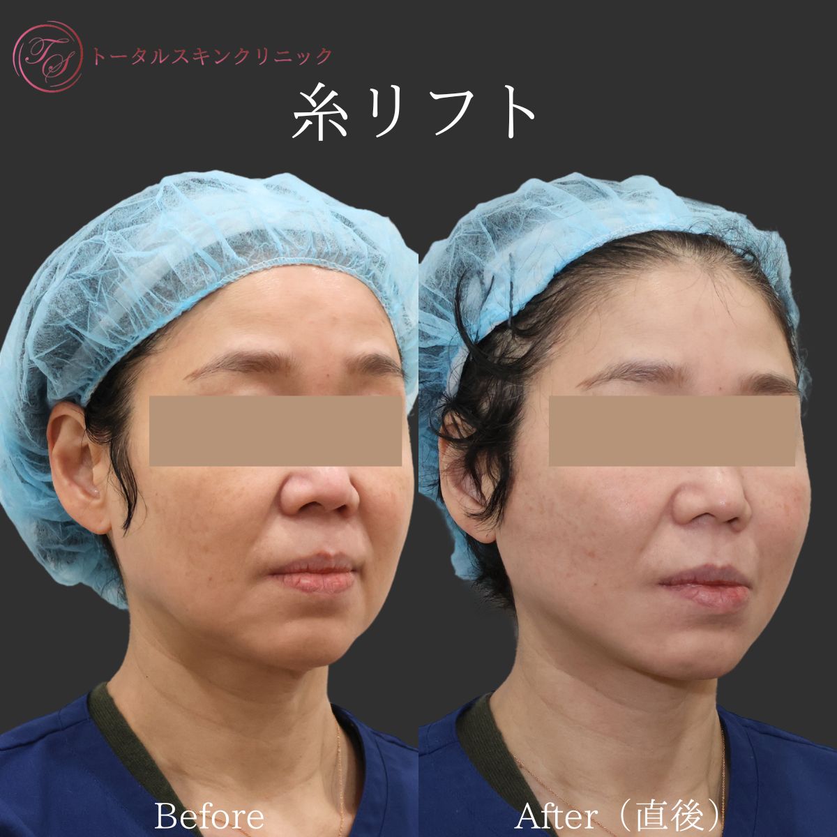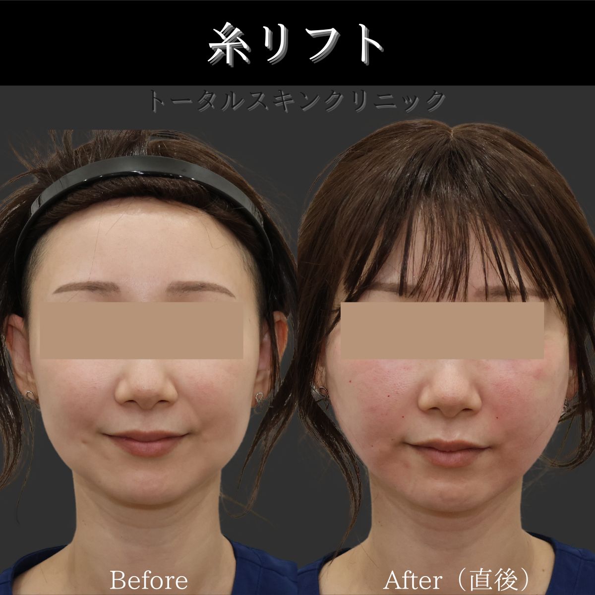 | 医師コメント | 糸リフトを受けていただいた方の、施術前と直後のお写真です。フェイスライン、マリオネットラインの改善がみられるかと思います。 |