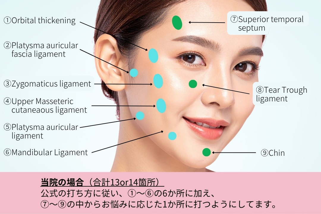 各ポイントには0.2mL程度(顎や頬骨靭帯は0.05~0.1ml)を注入し、薬剤が広がることで自然なボリュームアップと肌質改善が得られます。注入点が多いため、顔全体に「まんべんなく効果が広がりやすい」ことが最大のメリットで、プロファイロ以上にフェイスラインや頬のハリ感にアプローチできるのが特長です。